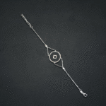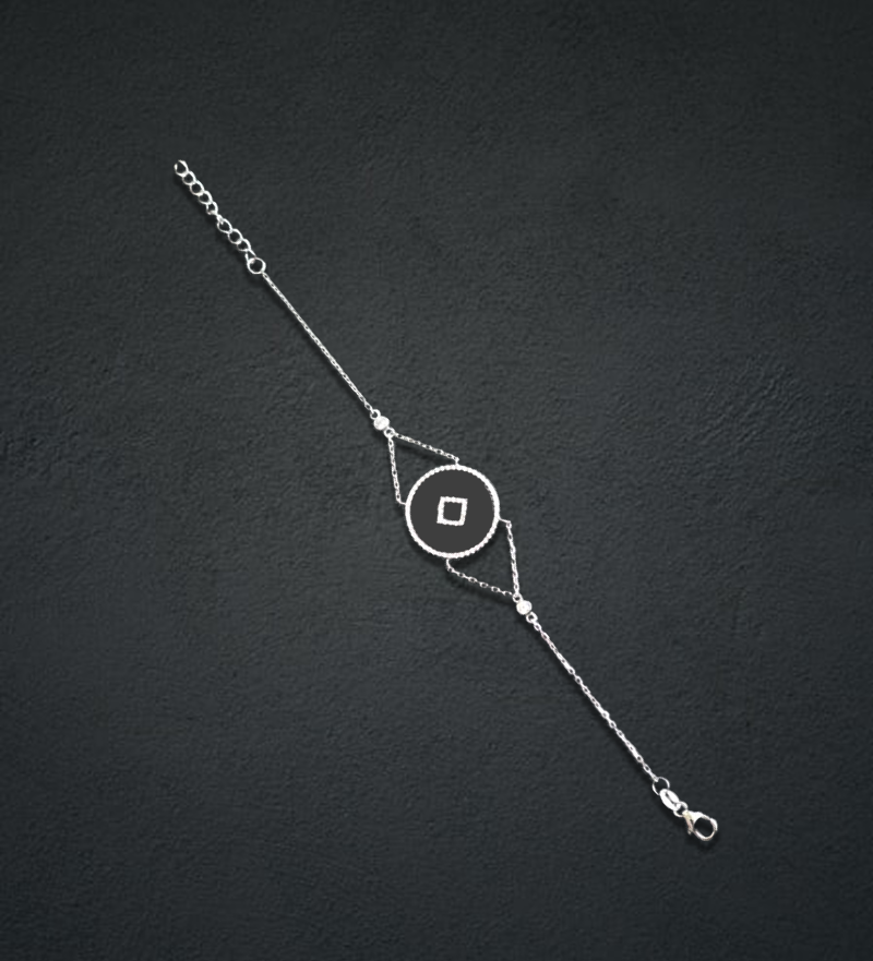 This sleek bracelet features a geometric design with a central circle containg a diamond shape,