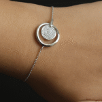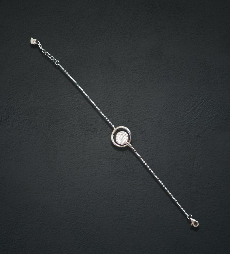 A delicate silver chain bracelet showcasing a mesmerizing diamond filled circle cradeld by a smooth outer loop.